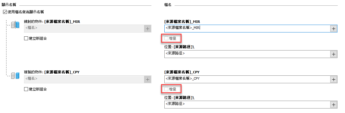 依預設,現在可以使用「應用程式選項」對話方塊的「鏡射和複製」頁籤中新加入的「增量」方塊,為複製或鏡射的元件指定增量編號。這些設定會保留,以便在「複製元件」和「鏡射元件」對話方塊中進行選取。