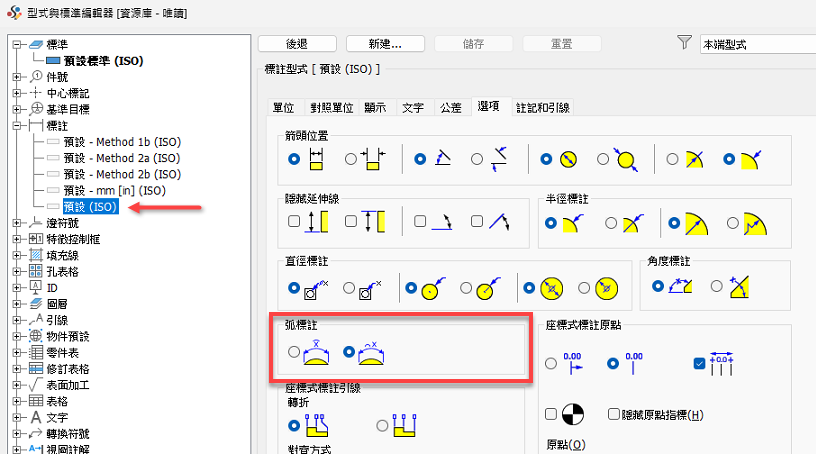 在「型式與標準編輯器」的「選項」頁籤中加入新選項,用於指定弧符號的位置 (在標註上方或前面)。