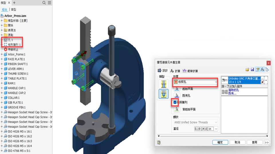 使用「螺栓連接產生器」時,您現在可以選取在組合環境中建立的陣列 (環形和矩形)。在「設計」頁籤的「放置」區域,加入「依照陣列」選項。