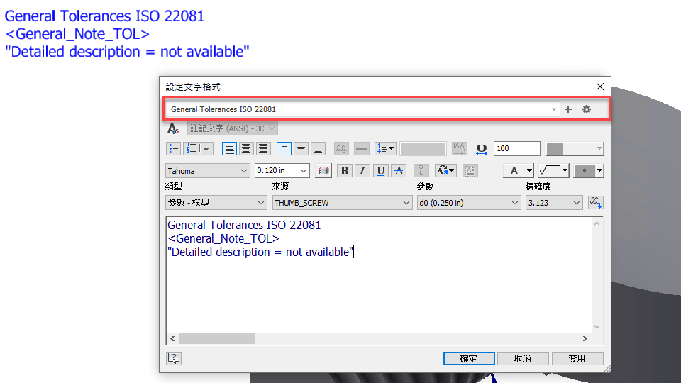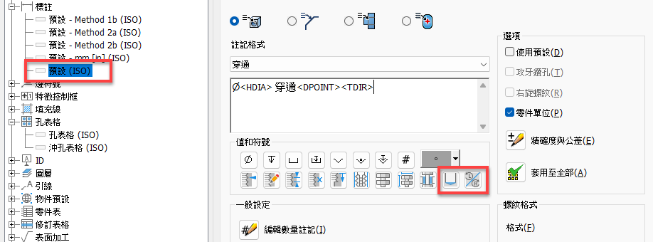 「一般註記」和「一般輪廓註記」的預置不會共用,需要為它們建立單獨的預置。但是,零件和組合共用「一般註記」的預置。
