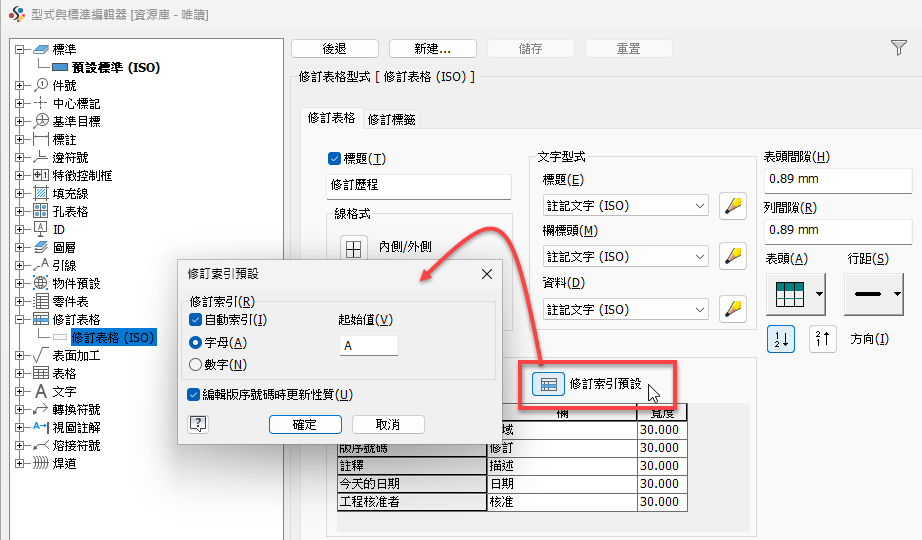 現在,可以從圖面樣板內而非透過修訂表格本身,指定預設編號 (字母或數字)。已在「型式與標準編輯器」中,為修訂表格加入新的「修訂索引預設」選項。