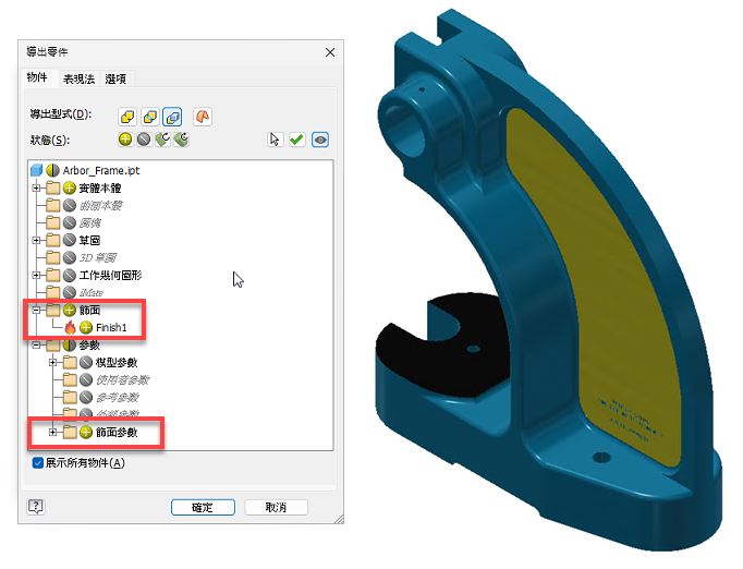 在「導出零件」對話方塊中,導出零件的所有飾面特徵均位於「飾面」資料夾中。排除的實體或「邊界框限定」實體上的飾面,則無法包含在其中。同樣地,來源零件中受抑制的飾面也無法包含在內。套用至多個實體的飾面將僅顯示在包括的實體上,而不會顯示在排除實體或「邊界框限定」實體的面上。