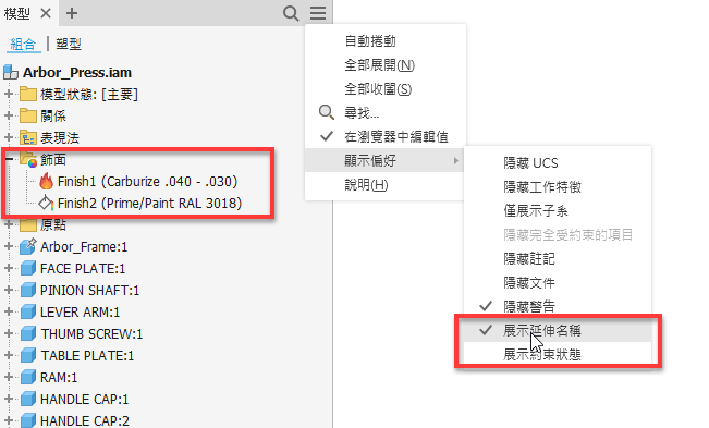 使用瀏覽器「顯示偏好」下拉式功能表中的「展示延伸名稱」選項,可在下列飾面類型的特徵節點名稱後顯示延伸資訊: