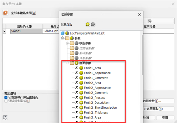 包括飾面特徵時,也會包括其參數,但可以手動排除參數。然而,如果飾面本身已排除,則無法包括飾面參數。