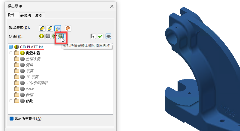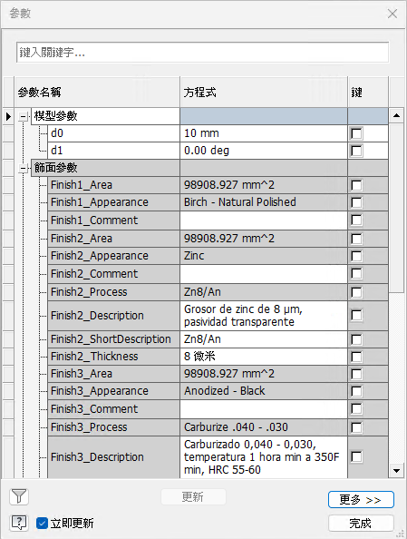 在「零件」中,使用「導出」指令和「製作零件」指令時,「外觀」、「飾面」和「飾面參數」現在可以導出至目標文件。包括飾面時,其所有參數都將自動包括在內。相反地,排除飾面時,其所有參數都將自動排除。請注意,無法導出受抑制的飾面。