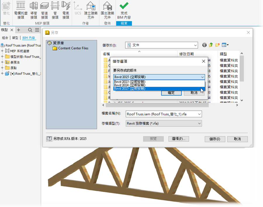 使用「BIM 內容」環境輸出 RFA 檔案時,按一下「選項」按鈕可存取 Revit 版本清單。