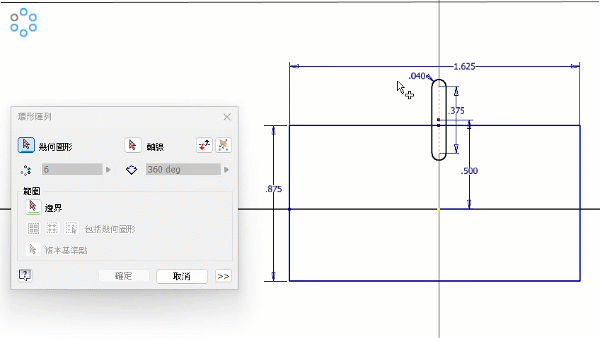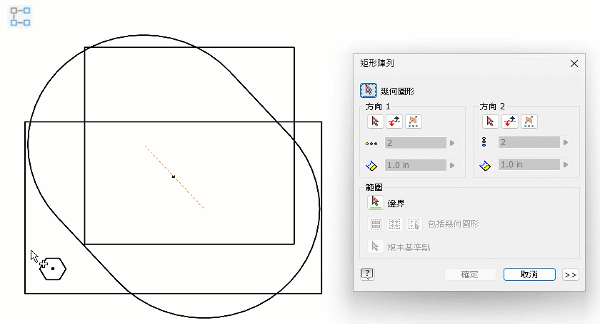 現在,您可以使用草繪式邊界,並且僅對該邊界內的草圖幾何圖形建立陣列。您可以決定在陣列中使用哪種幾何圖形,例如,僅使用邊界內的幾何圖形,使用所有形心在邊界內的幾何圖形,或使用基準點來確定 (使用所有基準點在邊界內的幾何圖形)。