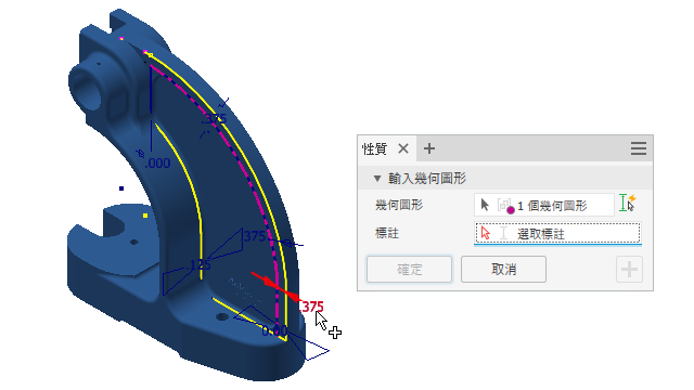 邊:若要建立此類型的轉換符號,可在建立過程中,從視圖或草圖選取特定幾何圖形。也可以重新貼附。