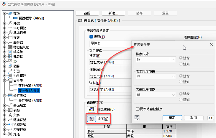 現在,您可以使用新加入的「排序」選項,在型式編輯器中直接為零件表,指定材料表中料件的排序順序。