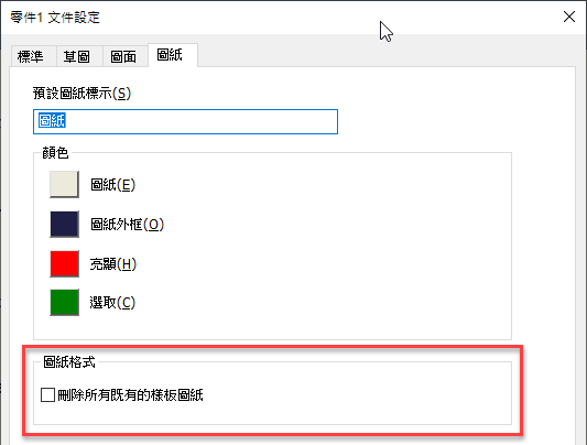 新的「刪除所有既有的樣板圖紙」選項已加入至「檔案設定」的「圖紙」頁籤,當您從預先定義的圖紙格式建立圖面時,此選項會自動移除既有圖紙。僅會保留此圖紙格式的圖紙。請確保在包含您所使用圖紙格式的同一文件(通常為樣板)中,也啟用此選項。