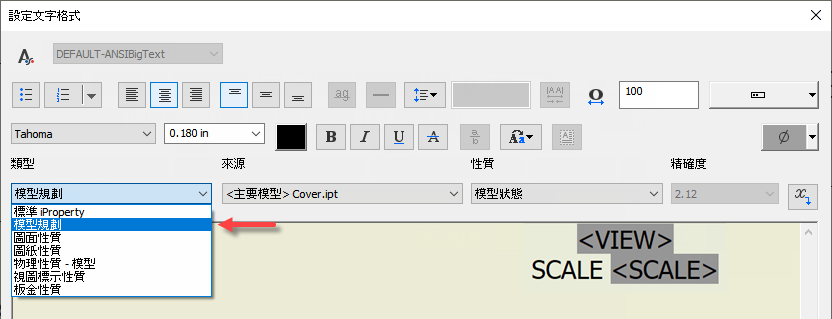 新的「模型規劃」品類已加入至「設定文字格式」對話方塊中的「類型」組合方塊,可讓您規劃視圖標示,以在圖面視圖中顯示模型狀態名稱。對視圖模型狀態所做的任何編輯,都會反映在視圖標示中。