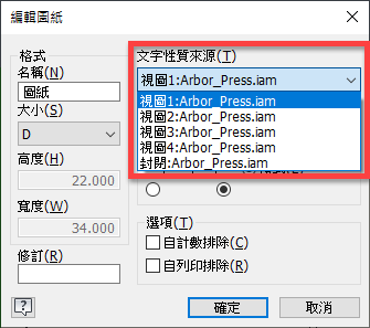 在「編輯圖紙」對話方塊中,使用「文字性質來源」下拉式功能表指定視圖模型參考。