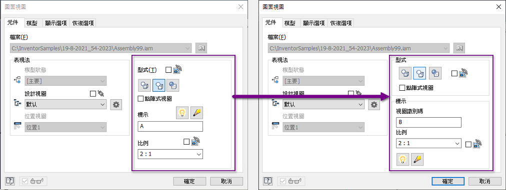 可以選取任何視圖模型參考,做為圖紙中文字、標題欄框和草圖符號的主要性質來源。先前,文字中的性質永遠參考第一個圖面視圖中的模型。