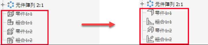 在組合瀏覽器中,更新了抑制的板金和熔接件零件的圖示,以反映取消抑制圖示的外觀。請注意,在您取消抑制並再次抑制之前,舊的受抑制板金和熔接件圖示不會變更為新圖示。