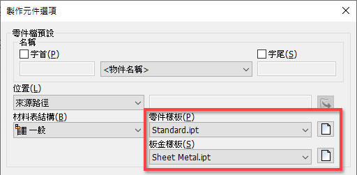 新的「板金樣板」選項已加入至「工具」>「文件設定」>「模型」頁籤 >「製作元件選項」對話方塊,以選取或瀏覽至用於建立新板金零件檔的樣板。