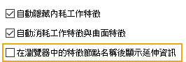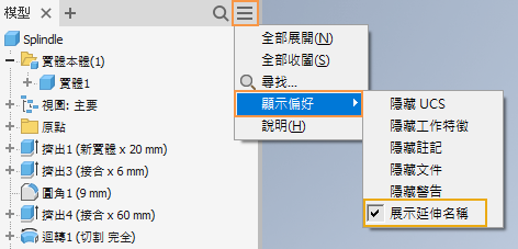 增強了「在瀏覽器中的特徵節點名稱後顯示延伸資訊」選項 (可從「應用程式選項」/「零件」頁籤存取) 和「展示延伸名稱」選項 (可從模型瀏覽器工具功能表中存取),以支援以下指令: