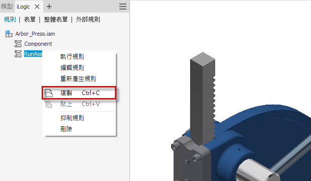 現在,在「iLogic 瀏覽器」中複製並貼上規則變得更加輕鬆。您可以直接在瀏覽器中選取 iLogic 規則,使用關聯式功能表中的「複製」指令,然後將其貼到其他零件或組合中。