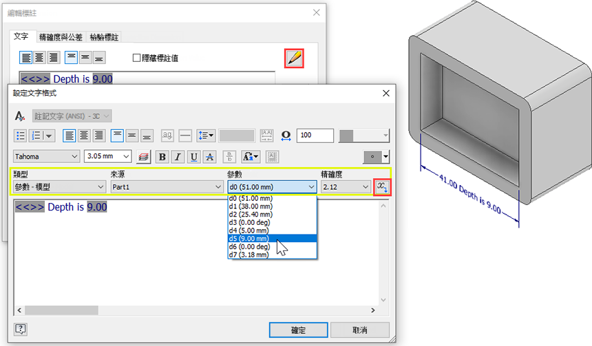 現在,您可以使用「設定文字格式」對話方塊中的選項,為「3DA 引線文字」和「一般註記」加入矩形邊框。