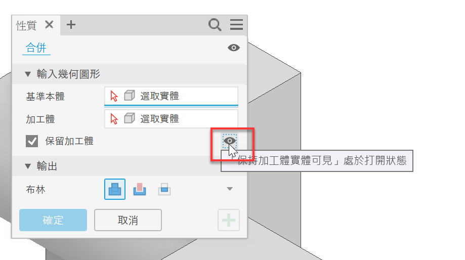 在「合併」和「掃掠」指令中加入新的切換按鈕,可讓加工體實體在下次選取時保持可見。