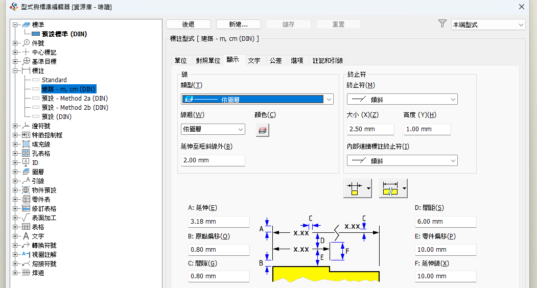現在,您可以根據 DIN 1356-1,使用公制單位建立建築標註。
