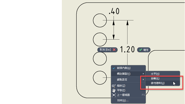如果設計中有等距特徵,您現在可以在圖面中定義兩個新標註類型,即「線性總和」和「角度總和」標註。