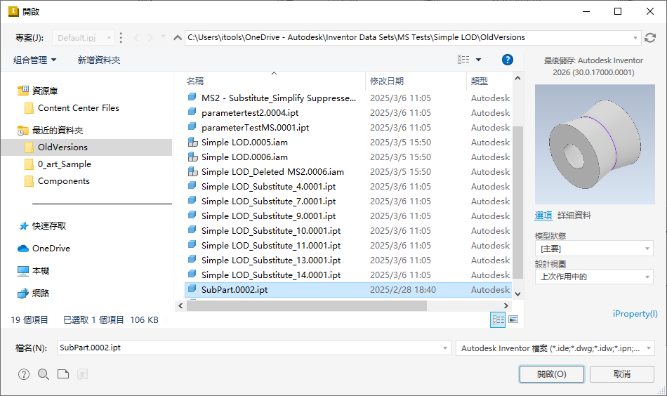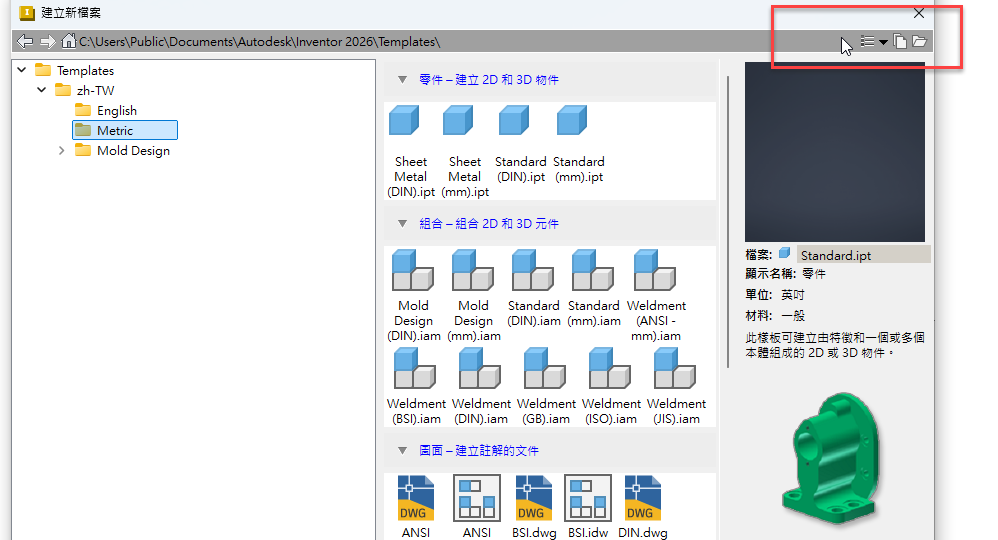 在此版 Inventor 中,對「檔案開啟」和「儲存」對話方塊進行了現代化改造,以使用標準的 Windows 檔案對話方塊元件,並加入了一些其他增強功能。
