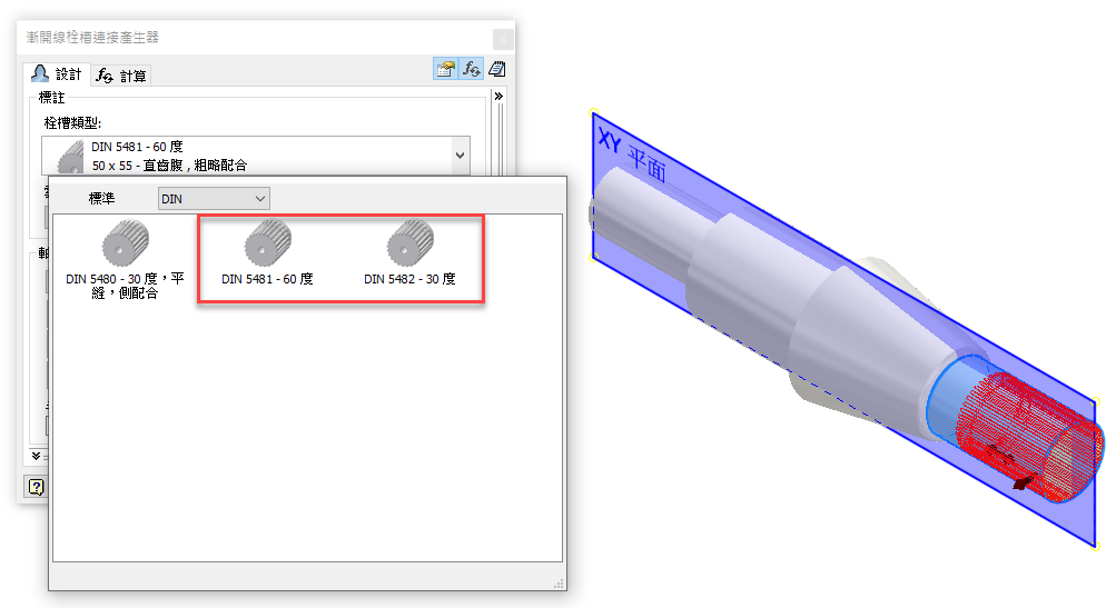 「漸開線栓槽連接產生器」現在包括兩種類型的漸開線栓槽連接:DIN 5481 - 60 度和 DIN 5482 - 30 度。
