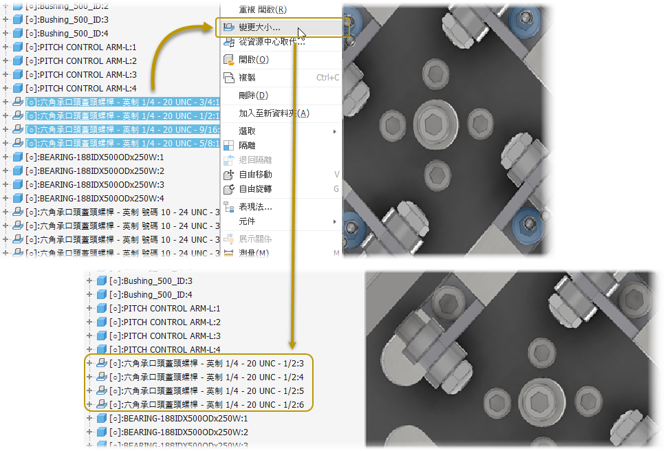 若要修改接頭值,請在模型瀏覽器按一下接頭,並編輯其值。若要編輯接頭,請在模型瀏覽器按兩下接頭以顯示對話方塊,或在圖形區域按兩下接頭圖像以編輯接頭。