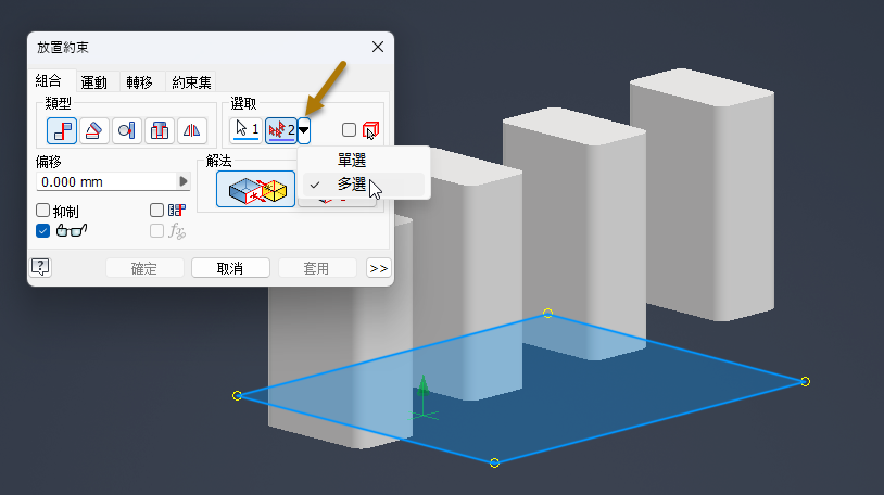 對於貼合約束,現在可以選取多個與第一個選取貼合的約束。放置約束時,請在「選取」區域中使用新的「多選」圖示列選項。編輯時無法進行多重選取。