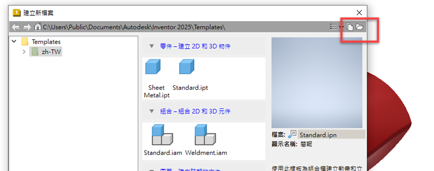 現在,使用「建立新檔案」對話方塊,可以更輕鬆存取樣板檔案。在右上角加入了兩個選項:
