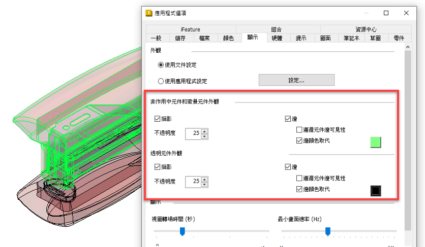 依預設,透明元件現在會帶邊彩現,因此在圖元區中檢視時,它們在視覺上與非作用中元件是不同的。可在「應用程式選項」的「顯示」頁籤上,分別自訂非作用中元件和透明元件的視覺型式。請在對話方塊的「非作用中元件和背景元件外觀」和「透明元件外觀」區域,指定這些選項。
