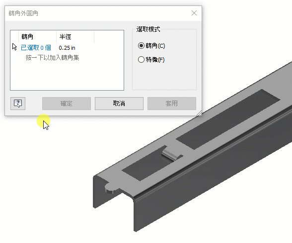 先前,使用「轉角外圓角」和「轉角倒角」指令,為轉角建立外圓角和倒角時,必須逐一選取轉角邊。現在,您可以使用窗選方式,選取要建立外圓角和倒角的邊。