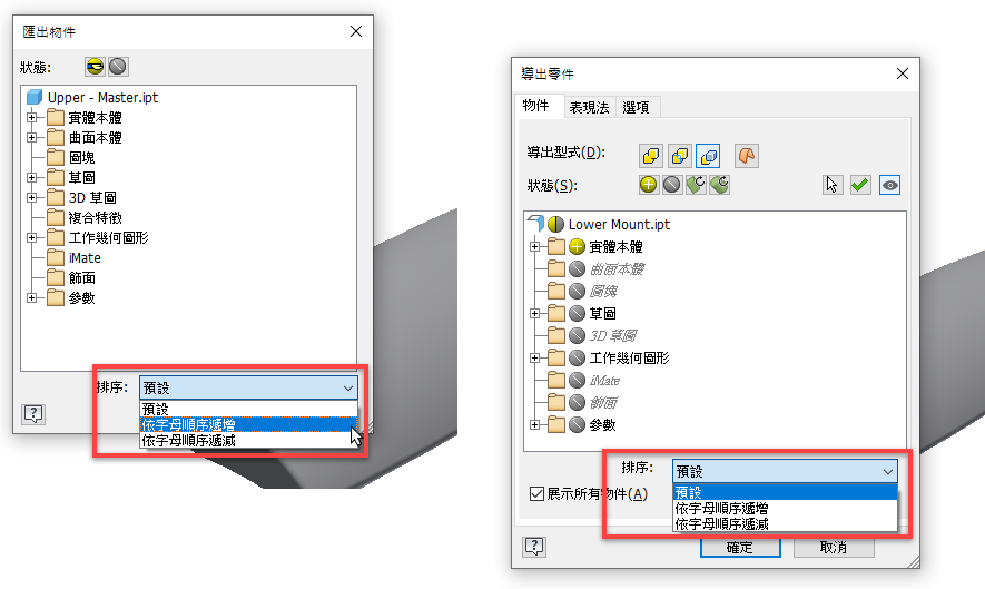 使用新的「排序」下拉式清單,指定樹節點 (包括參數) 的順序。該功能表已加入至以下對話方塊: