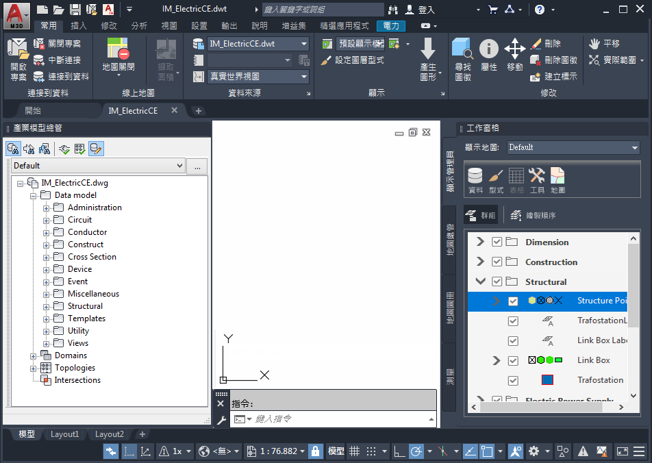 產業模型樣板在產業模型總管的左側顯示資料模型,在右側的工作窗格中顯示一組預先定義的行業特定圖徵類別。「維護」工作區功能區最適用於產業模型。
