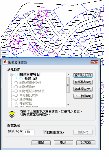使用圖面清理工具,您可以自動化常見的製圖和數化錯誤的修正過程。刪除重複項目、延伸未搭和懸掛的物件等。