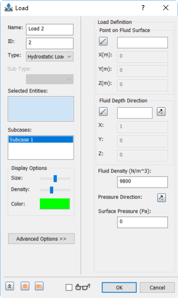 註: 靜水壓力可以用在非線性分析。如果位移較大,例如船體模型,負載的方向將會更新以保持與面互垂,但負載的大小不會變更。換句話說,當流體表面下方的模型「深度」變更時,壓力不會變更。