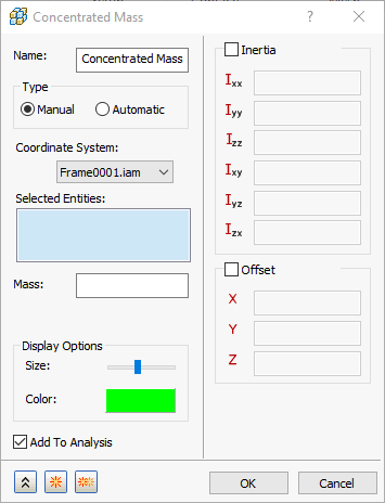 若要建立集中質量,請以右鍵按一下 「模型」樹 > 「物理屬性」 > 「集中質量」 > 「新建」。將開啟以下對話方塊。