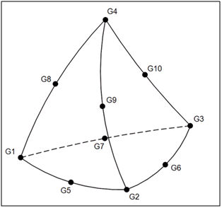 使用線性實體四面體元素的影像,我們可以看到元素座標系統的原點是在 G1。元素 X 軸是由向量 G1 –G2 定義。元素 Y 軸正交於元素的 X 軸,且在 G1-G2-G3 平面。從元素 X 和 Y的叉積找到元素 Z 軸。