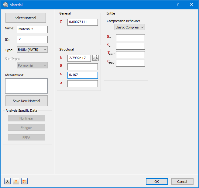 您可以在「一般」和「結構」區段下輸入楊氏係數、剪切係數、蒲松氏比、熱膨脹係數和質量密度。
