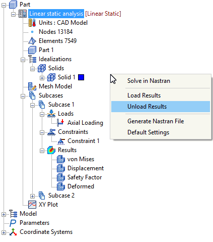 在模型數中的「分析」上按一下滑鼠右鍵,然後選取「卸載結果」從分析中移除任何既有結果。結果檔案不會從硬碟機刪除,但是結果會從電腦的記憶體卸載。