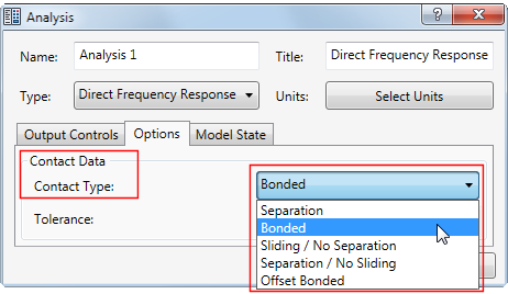 接觸類型和公差是根據「分析」對話方塊的「選項」頁籤中的規格。請先設置所需的接觸參數,再執行「自動」指令。