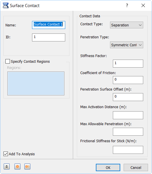 手動定義的接觸配對會加入樹狀目錄「模型」分支中的「表面接觸」節點下。如果建立接觸配對時,「加入至分析」選項處於啟用狀態,則接觸配對也會包含在樹狀目錄「分析」分支中的「表面接觸」下。一旦表面接觸配對加入至樹狀目錄的「分析」分支中,您就可以在分析中建立新的表面接觸 (透過關聯式功能表) 而不用移到「模型」分支。