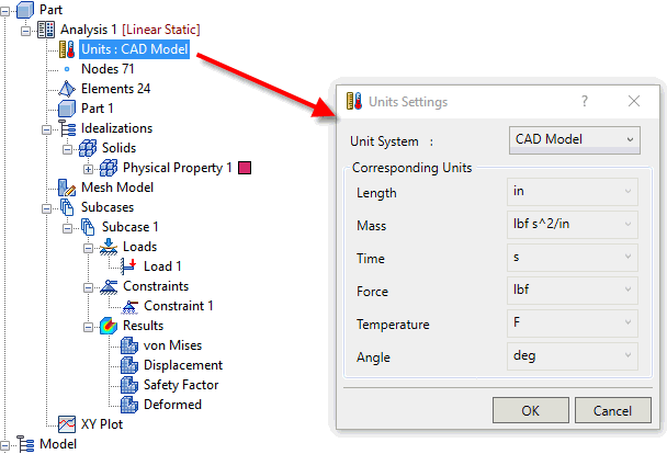 此項目是模型樹中「分析」之下的下一個子層。它提供一個選項可定義「分析」對話方塊中的單位系統。