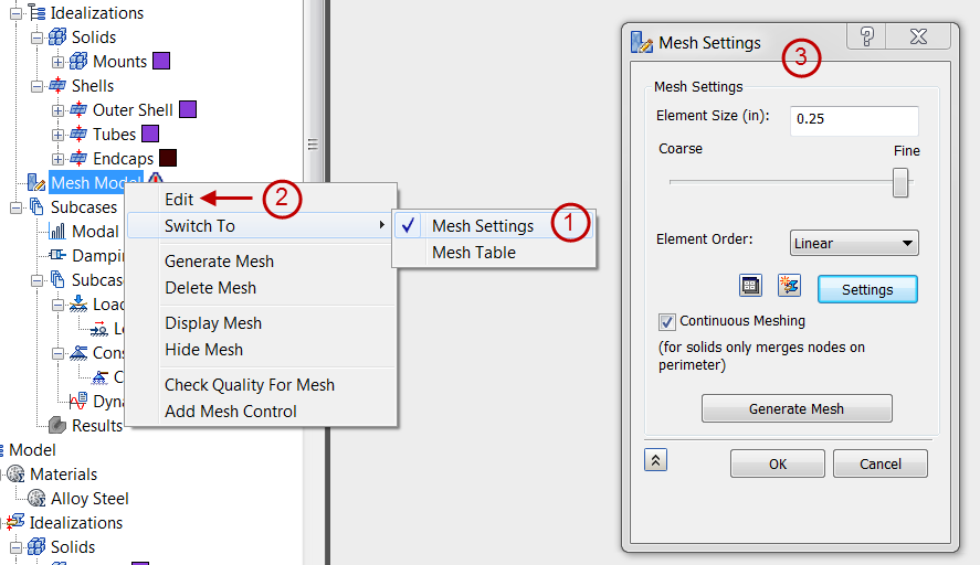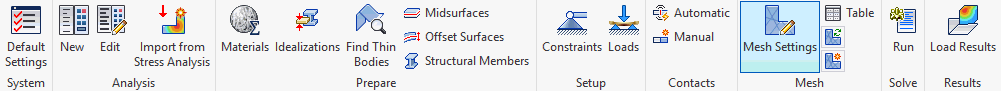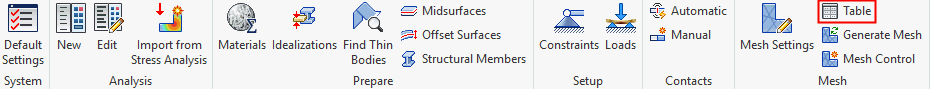 您可以整體或依零件定義網格設定。使用「切換至」選項可控制當您在瀏覽器中以滑鼠右鍵按一下「網格模型」並從關聯式功能表中後選擇「編輯」時要顯示哪個對話方塊。「網格設定」對話方塊用於整體定義網格。「網格表」對話方塊用於依零件定義網格設定。