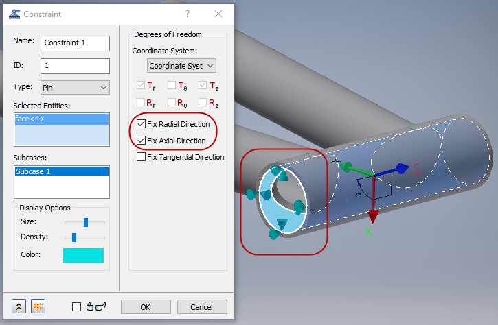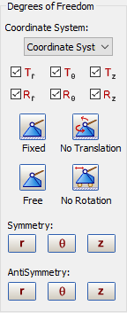 在圓柱座標系統中分別表示徑向、θ 與 Z 約束。
