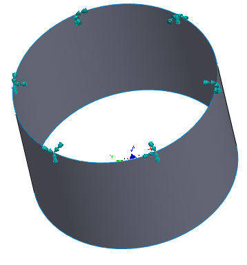 當「類型」為「釘住」時,只能對圓柱面套用約束。對圓柱表面套用表面釘住約束可阻止表面在徑向、軸向或相切方向的組合方向移動或變形。