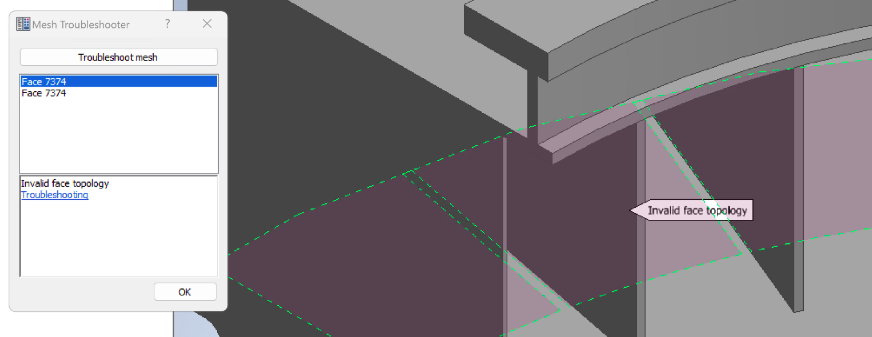 若要啟用「網格疑難排解程式」,請選取對話方塊上半部的「疑難排解網格」按鈕。對話方塊中有兩個輸出區段。上半部會亮顯網格建立失敗的圖元。下半部提供上半部所選圖元網格失敗的原因。