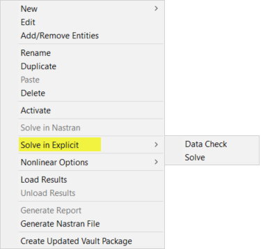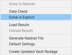 如果分析類型是「顯式動力學」或「顯式準靜態」,則主要的「分析」右鍵功能表上會出現「以顯式求解」選項。