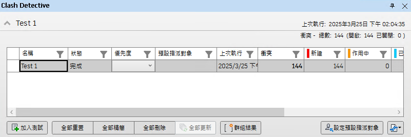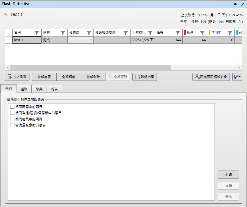 Clash Detective 可停靠視窗可讓您設置衝突測試的規則與選項、檢視結果、排序結果以及產生衝突報告。