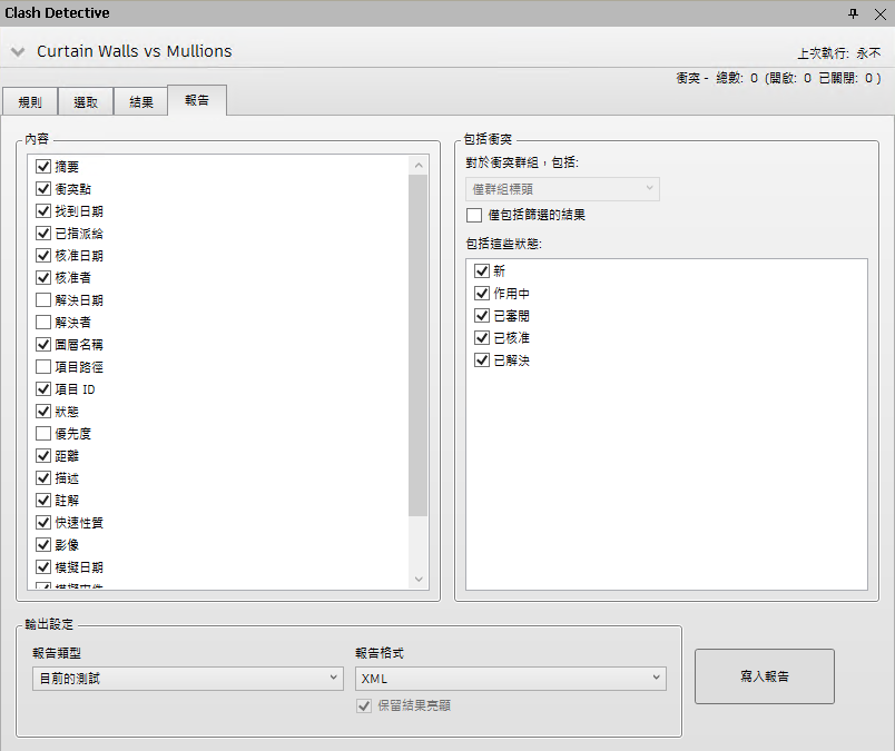 「報告」頁籤可讓您設置和寫入包含所選測試中找到之所有衝突結果的詳細資料的報告。